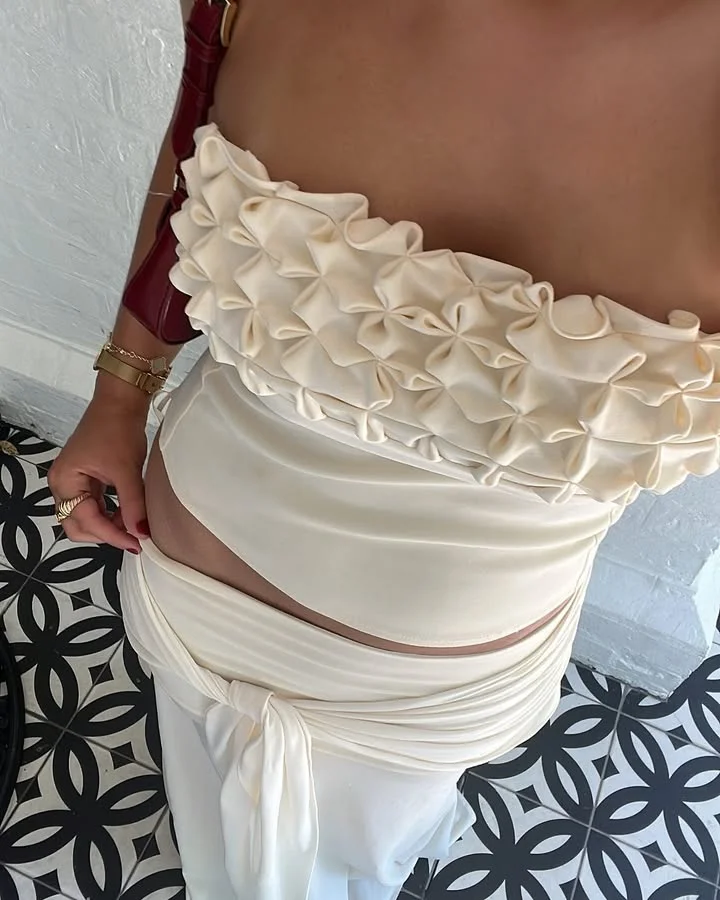 O Conjunto Vestido Blossom Étoile é a tradução do luxo etéreo em forma de moda. Criado para mulheres que desejam expressar elegância e magnetismo, este conjunto exclusivo um top tomara que caia com detalhe floral em 3D e uma saia longa drapeada de cintura alta que valoriza a silhueta de forma inconfundível.